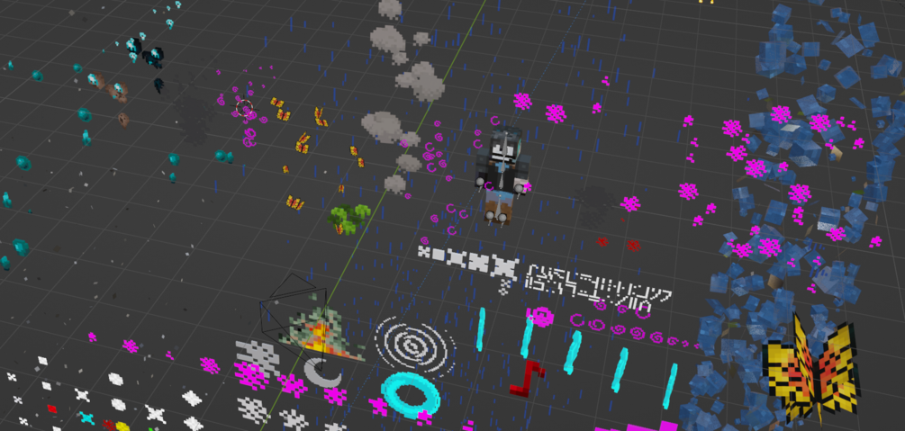 - Bubbles - Rain - Fireworks - Smoke - Delta Ash - Snow - Nether Portal Particles - Enchantment table - potion - camp fire smoke - Block Fireflies - 2D fireflies - 'FILE FLIES' - warden sonic boom - butter flies - spore particles - Leaves in wind - hearts - music notes - falling leaves - spawner flames - explosion